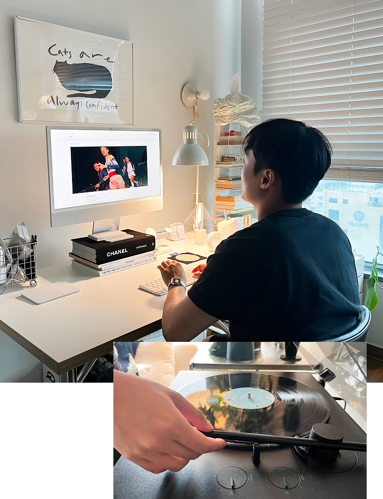 갈아입고 데스크 탑 앞에 앉아 본업을 이어간다.
