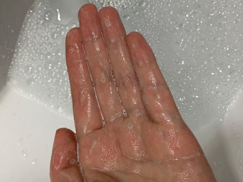 물로 묻히고 계속 문지르면 소금 알갱이가 녹으면서 거품이 나요.
