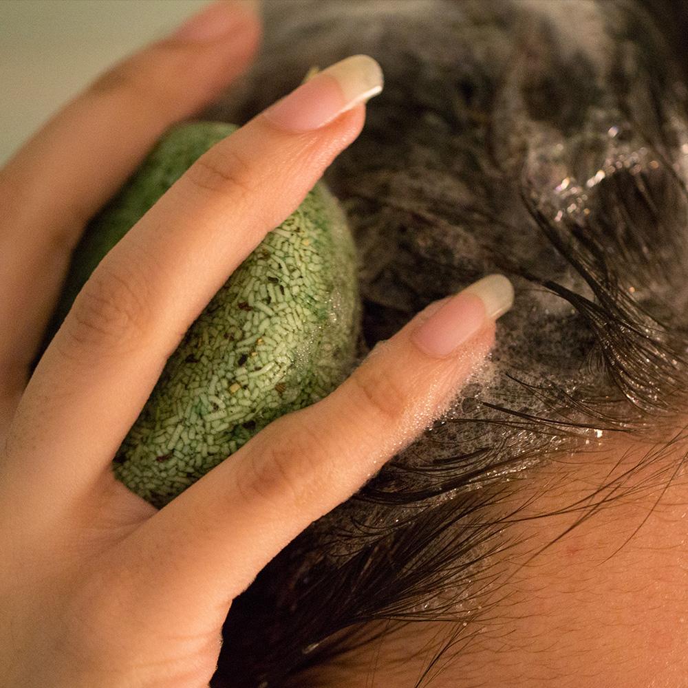 고체 형태의 샴푸로 젖은 모발에 거품을 내어 사용하며,